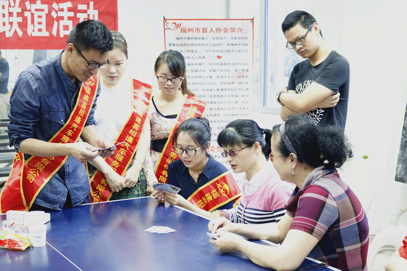 盲人教育的宗旨是:以手养口,是让盲人学有一技之长,做到自食其力。盲人通过良好的教育,在许多领域做出了骄人的成绩。在福州市盲人协会的成员中,就有按摩师、音乐教师、钢琴调律师、电脑速录员、心理咨询师等各种专业人才,他们不仅用智慧和双手为社会服务,而且他们的生活还有着别样的风采。盲人可以用电脑和触摸屏手机打游戏,还可以用QQ和微信交朋友,就连滴滴打车、淘宝购物等都能操作自如。喜相逢志愿者参与此次活动目的就在于,更加了解盲人的生活,也让盲人朋友更好地融入主流社会。