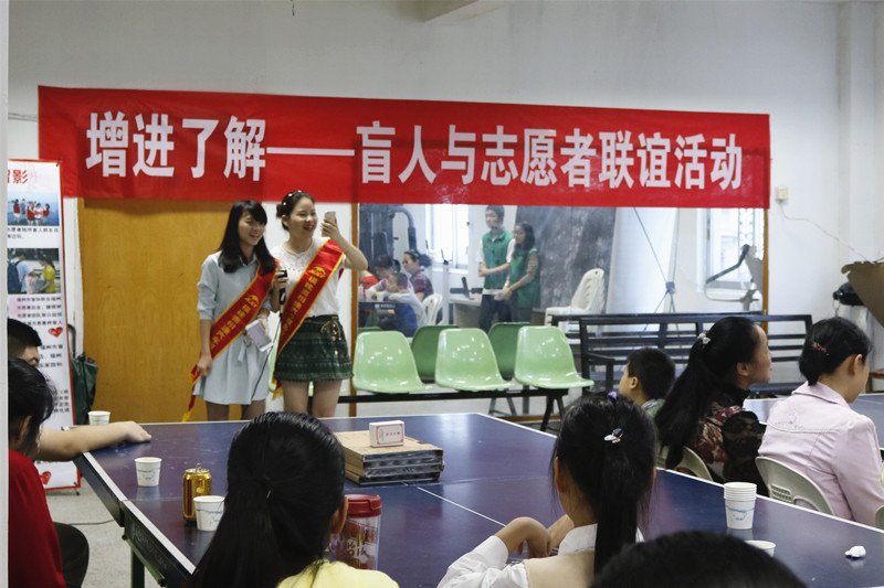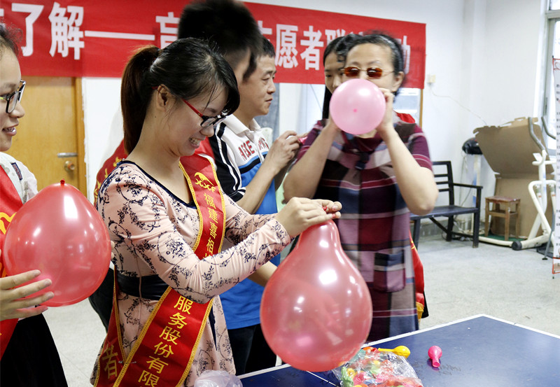 紧接着就是游戏环节,先是吹气球比赛,然后就是志愿者与盲人朋友们下象棋、打扑克。